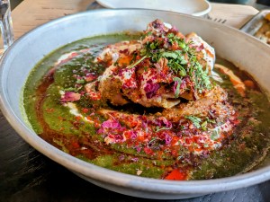- Marinated chicken thigh, spiced spinach sauce and garlic yoghurt