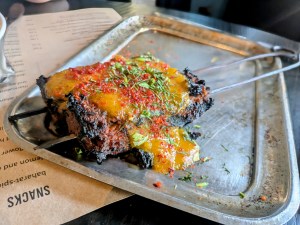 - Blackened sweet potato, saffron crème fraîche and harissa