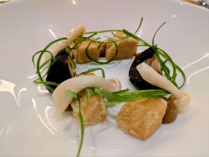 - Mushroom & miso broth, sesame & black garlic