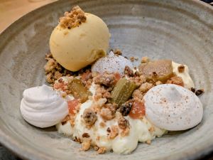 - Rhubarb and custard; poached rhubarb, rhubarb gel & custard chantilly served with meringue & vanilla ice cream