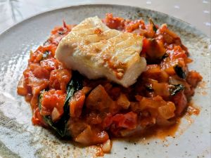 Basque-inspired codfish stew. Versatile dish where you can throw in almost anything. Suggestions include roasted bell peppers and beans. Add basil for an Italian twist. Pan fry the fish separately until golden for texture.