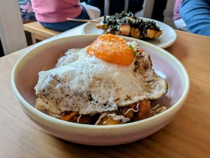 - Jersey royals – Crispy potatoes, fried egg, soy-cured egg yolk, gochujang mayo, spring onions