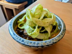 - Hand ripped noodles – Roe deer curry, black pudding, daikon, chilli crunch, spring onions, fresh green peppercorns, spiced cashews, dirty egg