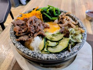 - Beef Bibimbap – Steamed rice, mixed vegetables and beef with a fried egg