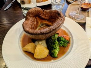 - Scottish sirloin of beef Sunday roast served with roasted carrots, potatoes, broccoli, homemade Yorkshire pudding & beef gravy