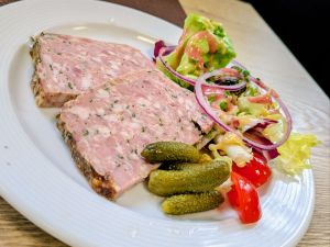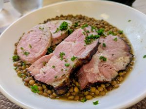 - Main: Pork loin and lentils (Lentilles et saucisses de Morteau)